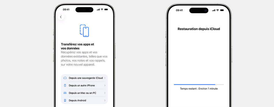 Vous n’avez pas accès à votre ancien iPhone pour diverses raisons (panne, vol, perte...) ? Lors de la configuration, choisissez "Restaurer à partir d'iCloud" et sélectionnez la dernière sauvegarde. Vous retrouverez toutes vos données enregistrées à ce moment-là.