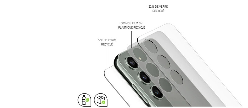 Les téléphones de cette série intègrent 22 % de verre recyclé sur leurs faces avant et arrière ainsi que du plastique recyclé pour leur châssis. C'est un début pour marquer l'engagement de la marque en matière de protection de l'environnement.