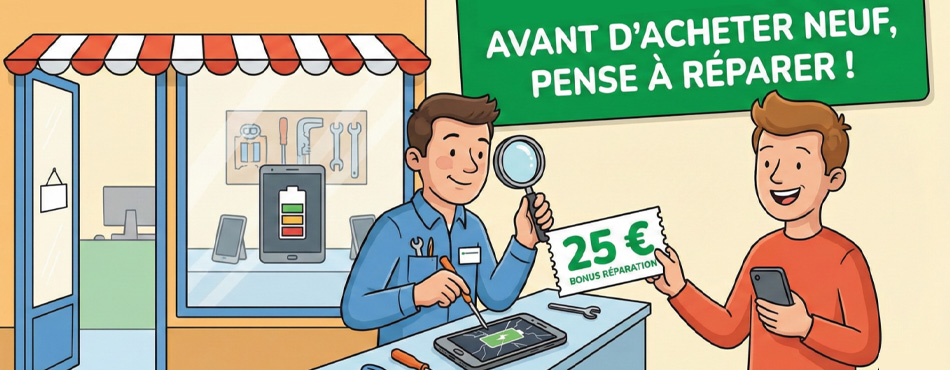 Mais avant d'acheter neuf, pensez à la réparation ! Le dispositif gouvernemental Bonus Réparation offre 25 € de réduction immédiate chez les réparateurs QualiRépar pour changer un écran ou une batterie.