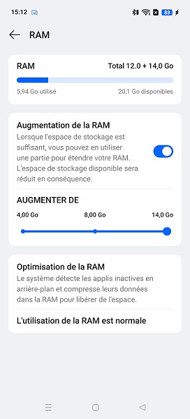 Le Realme 14 Pro+ dispose d’origine de 12 Go de mémoire vive, et la marque offre la possibilité de l’étendre en utilisant de l’espace de stockage. Sur le modèle de test, on bénéficie au maximum de 12 Go de RAM + 14 Go pris sur le stockage. Associé au nouveau processeur Qualcomm Snapdragon 7s Gen 3, on peut espérer de très bons résultats.