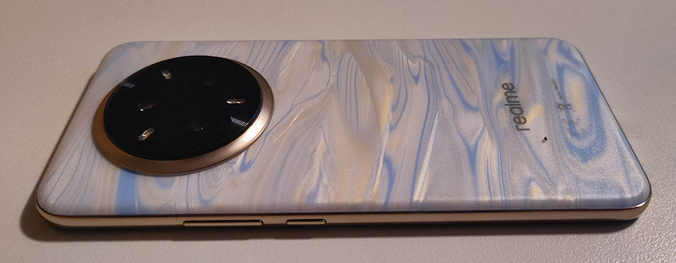 Difficile de rester indifférent devant le design du Realme 14 Pro+. Sitôt sorti de sa boite, il fait son petit effet auprès de l’assistance. Un peu à cause de son bloc photo assez inhabituel et sur lequel nous reviendrons plus loin, mais surtout du fait de sa coque nacrée et marbrée du plus bel effet.
