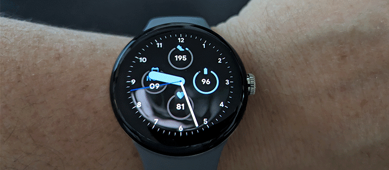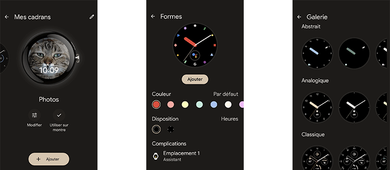 La Pixel Watch est extrêmement customisable. Par exemple, pour l’affichage, l’application offre 19 cadrans de base que l’on peut ensuite modifier en termes de fonds (aiguilles, gros chiffres, photo (30 max) etc.), de couleurs (jusqu’à 35), et de style de chiffre (jusqu’à 6). On peut ensuite choisir si on souhaite la présence de la trotteuse ou non, et on a un grand choix de combinaisons (des affichages autres que l’heure et les minutes, au maximum quatre en même temps) parmi 34 possibilités. La personnalisation est donc plus que complète à mon goût et très accessible. Les modifications sont intuitives et suffisamment nombreuses pour modifier le cadran selon ses envies. Et tout cela concerne seulement l’affichage principal de la montre. En effet, vous avez ensuite la possibilité de choisir les cartes (15 max) qui pourront être consultées sur le cadran. Elles permettent d’obtenir rapidement une information ou un raccourci vers les actions que l’on utilise le plus.