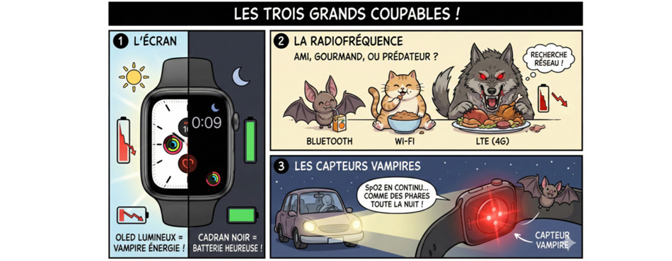 Avant de plonger dans les réglages spécifiques, comprenons que trois grands coupables mangent la batterie de votre montre connectée dans l'ombre :