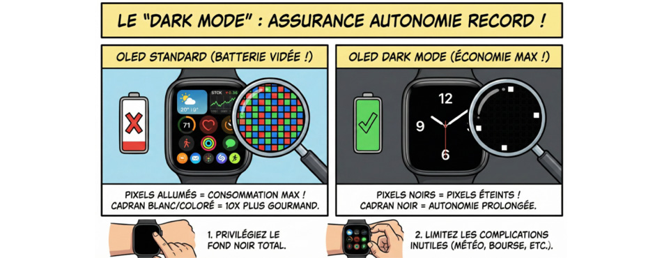 Pour votre écran OLED (Apple, Samsung, Google), le choix du cadran est le premier levier d'optimisation. Contrairement aux écrans LCD, chaque pixel d'un écran OLED génère sa propre lumière. Conséquence ? Un pixel noir est un pixel éteint qui ne consomme rien. Un cadran à dominante blanche ou très coloré avec de nombreuses complications peut consommer jusqu'à 10 fois plus d'énergie qu'un modèle minimaliste noir.