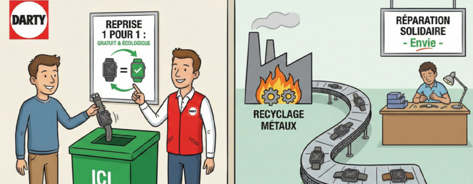 Si votre montre ne fonctionne plus ou n'a plus de valeur marchande, elle entre dans le programme de recyclage de Darty, qui s'engage pour l'économie circulaire.