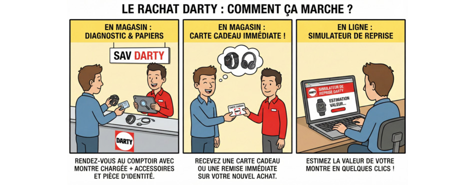 Si votre montre est encore en bon état de marche, Darty propose de vous la racheter. Le montant dépend de l'argus du jour, du modèle et de son état esthétique.