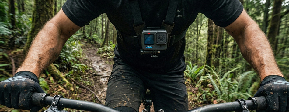 les fixations corporelles : le harnais de poitrine (Chesty) pour le vélo/ski ou le bandeau de tête pour une vue "à la première personne" (POV).