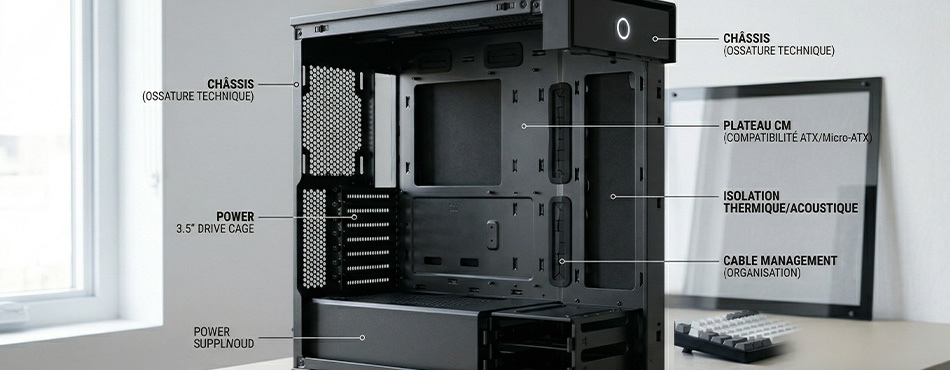 Le boîtier, souvent appelé "tour PC", est la structure métallique ou plastique qui constitue l'ossature technique de votre ordinateur. Il ne s'agit pas d'une simple boîte, mais d'un châssis conçu pour maintenir chaque composant (carte mère, alimentation, stockage) à sa place précise tout en assurant leur isolation thermique et acoustique.