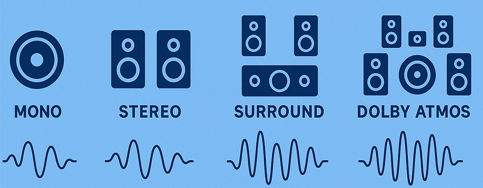 Puis, dans les années 70, nous sommes passés au son stéréo. C’est-à-dire, le son à gauche et à droite était différencié pour avoir des effets gauche-droite. On utilise 2 canaux différents pour le son. On l’appelle communément stéréo 2.0.