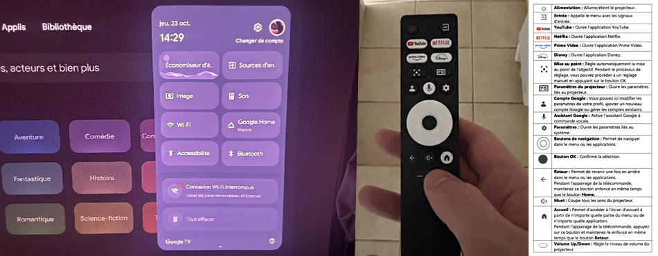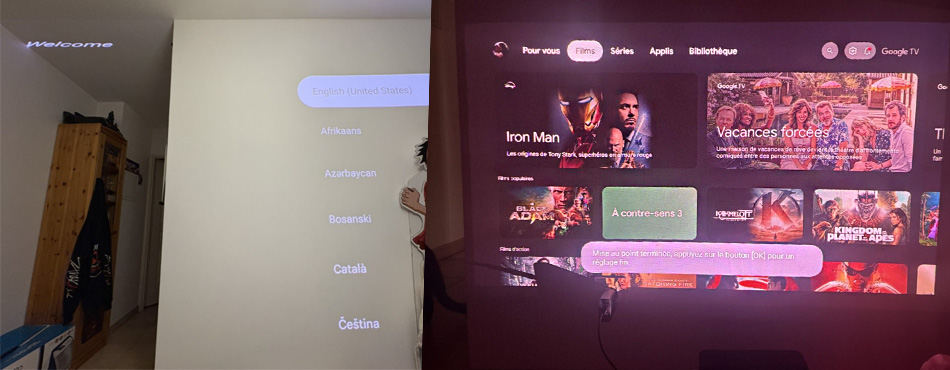 Tout se fait très rapidement et simplement, il n’y a qu’à suivre les indications à l’écran. Il procède a la mise au point et au réglage des trapèzes de façon automatique. Mais bien sûr, tout ceci peut être réglé de façon manuelle dans les réglages de Google TV.