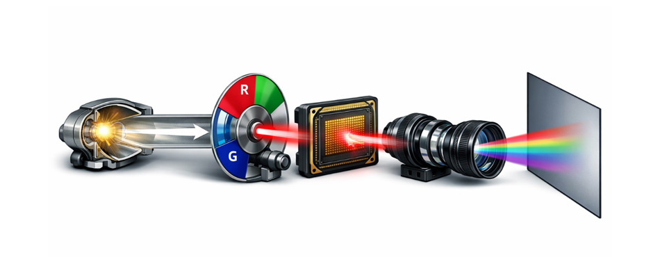 Technologie développée par Texas Instrument utilisant un système à micromiroirs et une roue chromatique pour afficher les couleurs.