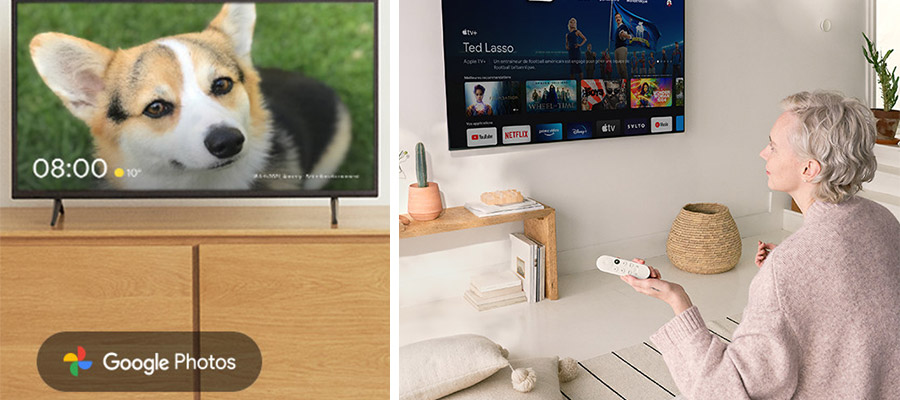 Découvrez Chromecast en version HDAvec son nouveau design et sa télécommande dédiée, Chromecast avec Google TV vient d'être commercialisé. Non seulement la résolution est clairement optimisée (jusqu'en 4K HDR) mais vous pouvez désormais accéder à Youtube et Netflix directement, commander l’assistant vocal, allumer/éteindre la TV et surtout naviguer à travers la nouvelle interface Google TV. Celle-ci vous propose de regrouper toutes vos séries et tous vos films préférés, issus de vos plateformes préférées. En outre, vous bénéficierez de recommandations personnalisées et vous pourrez diffuser des contenus via vos autres objets connectés (smartphone, ordinateur, tablette...). Enfin, bienvenue dans une interface qui centralise toutes vos recherches et vous permet même de comparer les prix des différentes applications. Pour lire la vidéo l'activation des cookies publicitaires est nécessaireGérer mes cookiesCliquer ici pour afficher la vidéo |