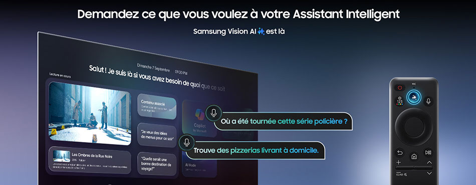 L'innovation majeure de Samsung Vision AI Companion réside dans sa capacité à instaurer un dialogue fluide et bidirectionnel avec l’utilisateur. Fini les menus complexes et les saisies fastidieuses : via un bouton dédié (orné de 4 étoiles) sur la télécommande ou par commande vocale, vous pouvez désormais poser des questions complexes.