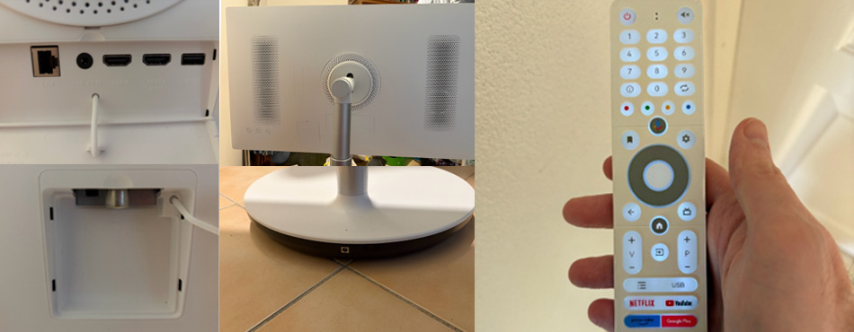 La prise d’alimentation se trouve également à l’arrière du pied de la TV, ainsi qu’un bouton pour arrêter l’alimentation. La télécommande fournie est rétroéclairée, ce qui est très pratique pour retrouver les boutons dans le noir.