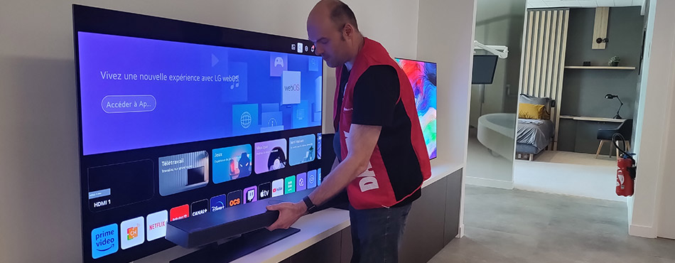 Cette barre peut bien sûr s’utiliser avec n’importe quelle TV mais vous pourrez en tirer la quintessence si vous l’associez avec une TV OLED LG C2 ou C3. En effet, LG fournit un support qui se fixe au téléviseur afin de la disposer à une place idéale sur pied ou même en installation murale sans avoir à faire de trous supplémentaires.