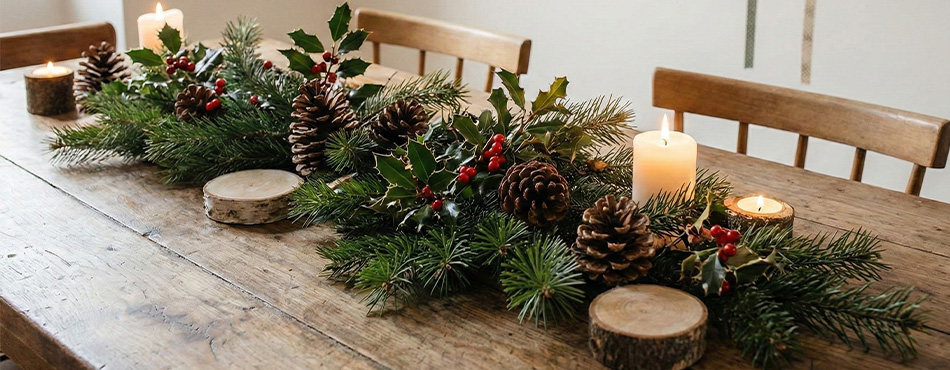 Inutile de transformer votre salon en magasin de jouets. Pour une décoration élégante et peu coûteuse, inspirez-vous de la nature. Quelques branches de sapin, des pommes de pin, du houx ou des rondins de bois en centre de table apporteront une touche végétale authentique très appréciée.