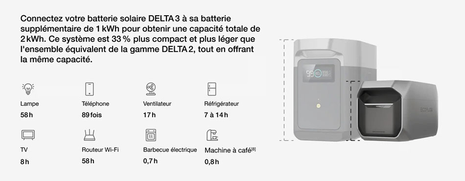 Estimation de l’autonomie : Durée (h) = Capacité (Wh) ÷ consommation (W). La Delta 3 possède une batterie de 1 024 Wh. Par exemple : pour un appareil consommant 100 W (PC de bureautique avec écran), D= 1024/100 soit une autonomie d’environ 10h (un peu moins en réalité, en tenant compte des pertes de conversion).
