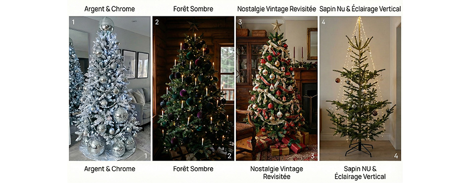 La couleur dominante de Noël 2025 est l'Argent Chromé, souvent associé au Bleu Glacier ou au Bordeaux Profond. L'esthétique générale est plus froide et brillante que les années précédentes.