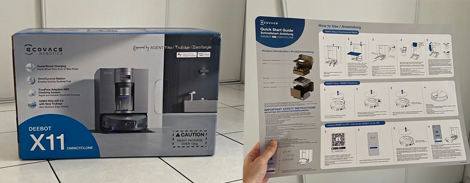 Le X11 OmniCyclone arrive dans un gros carton de 15 à 20 kg. Premier point positif : il est très bien emballé et parfaitement protégé. Il est également très design avec une station tout en gris métallique, noir et transparente agréable à l'oeil, et qui se fond bien dans un intérieur moderne. À l’ouverture, on retrouve dans l’ordre :