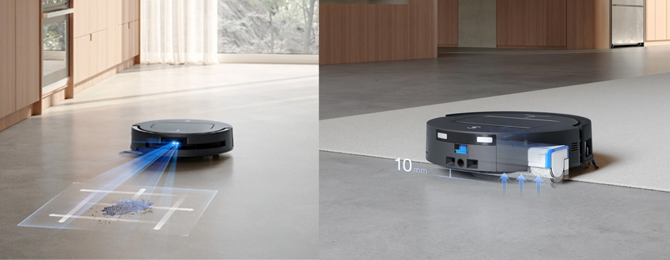 Concernant le nettoyage humide, sa fonction la plus pratique pour les intérieurs mixtes (sols durs et tapis) est sans doute le relevage automatique de la serpillière de 15 mm. Dès qu'il détecte un tapis, l’aspirateur robot laveur lève ses patins pour continuer l'aspiration sans jamais mouiller vos moquettes. On peut également citer la brosse TrueEdge 3.0, grâce à laquelle les plinthes et les coins ne passent plus à la trappe.