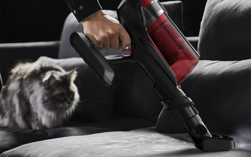 Bien que de nombreux accessoires et suceurs soient disponibles avec les deux modèles, la tête d’aspiration principale, nommée Deep Power Led Vision, offre déjà les principales fonctions que l’on attend d’un aspirateur moderne. Elle dispose d’un éclairage intégré pour mieux visualiser poussières, cheveux et poils d’animaux dans les endroits sombres, révélant ainsi les espaces à privilégier lors de votre nettoyage. De plus, par une simple pression sur le panneau de commande intelligent, vous choisissez le mode « auto », lequel ajuste la puissance en fonction de la surface du sol. Une manière de préserver la batterie et d’obtenir le régime le plus efficace en passant d’un parquet à un tapis, par exemple. Cette fonctionnalité se double d’un détecteur de résistance, qui réduit la vitesse de rotation de la brosse en cas de difficultés, évitant ainsi un fastidieux déblocage.