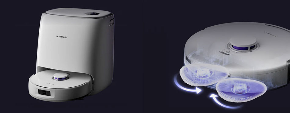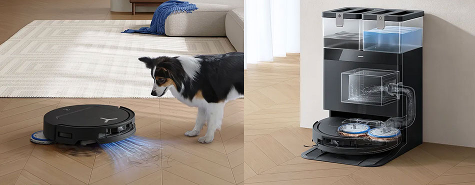 Il est également équipé de deux serpillères rotatives, dont une extensible pour aller au plus près des plinthes et murs. La station tout-en-un gère la vidange du bac à poussières et l’auto-nettoyage des serpillères ainsi que du séchage à l’air chaud.