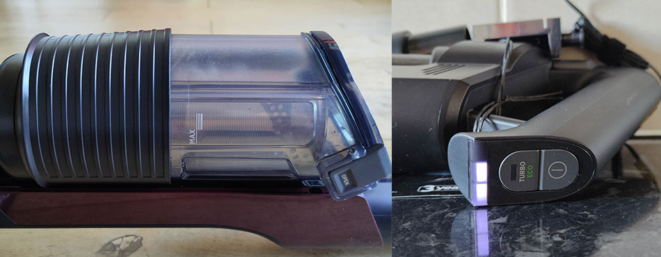L’aspirateur Hoover HF2 Ultra Compact X3 dispose d’une poignée ferme, avec le bouton d’allumage / extinction sur la partie supérieure. 3 indicateurs lumineux permettent de visualiser le niveau de charge, et on peut activer les mode Eco et Turbo d’un simple appui sur un bouton, lui aussi aisément accessible.