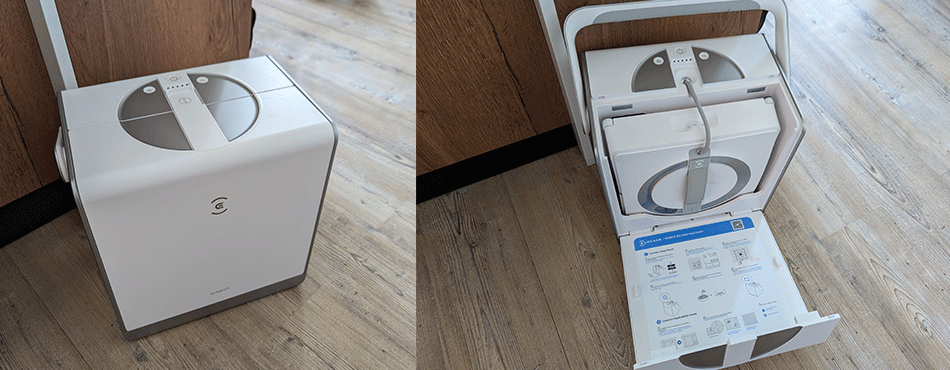 Il se présente sous la forme d’une valise, très pratique à transporter. En effet, le Winbot W2 Omni possède une batterie déportée sous forme de valise afin d’éviter la corvée du fil secteur. On retrouve des rangements intérieurs pour y stocker la solution de nettoyage, le câble de charge et 2 lingettes pour vitres. Légère, la station affiche un poids de 5,2kg, tandis que le robot pèse 2kg.