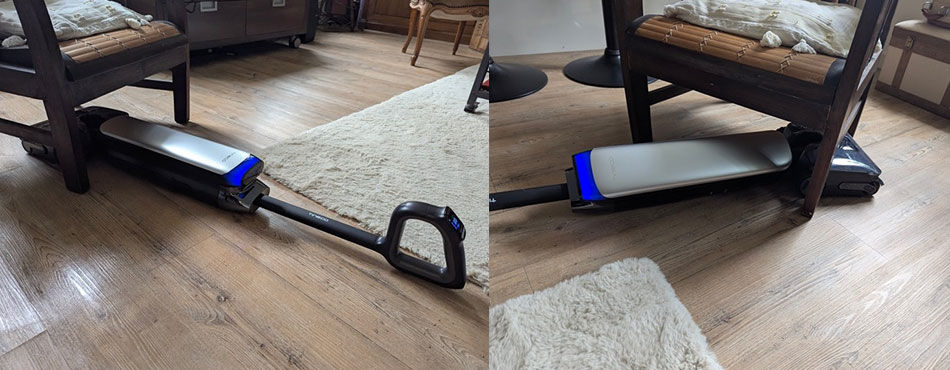 Il n’a pas pu passer sous le meuble TV (9 cm) mais le nettoyage à plat a été utile pour passer sous les fauteuils, la tête du Tineco mesurant 12,85 cm au plus haut pour une utilisation à 180°.