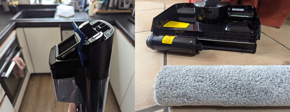 Une fois le nettoyage terminé, il suffit de le mettre sur la station et de lancer l’auto-nettoyage. Ce modèle bénéfice de la technologie Flashdry, il va donc laver la brosse et le conduit à l’eau chaude (85°) pour désincruster tâches et bactéries et ensuite sécher la brosse (à l’air chaud toujours) ainsi que le filtre pour éviter les mauvaises odeurs. Le processus fait quand même beaucoup de bruit, mais c’est très rapide, 2 minutes de lavage et 5 de séchage.