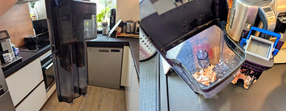Bon, le capteur ILOOP s’est un peu affolé, mais il a tout nettoyé en une seule fois, à part la coquille d’œuf (gros morceau) où j’ai dû repasser une deuxième fois. Autre bonne surprise, il ne s’est pas mis en défaut après pour me dire que le réservoir d’eau sale était plein et bouché (sur la photo ci-dessous, on peut bien voir la séparation des solides et des liquides).