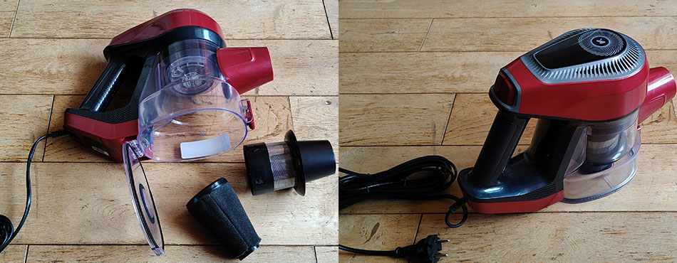L'aspirateur semble d'une utilisation très simple, puisqu'il dispose d'un bouton marche / arrêt et d'un autre pour la sélection de la puissance d'aspiration. Pour accéder au filtre, il suffit d'appuyer sur un loquet et de dévisser le cône de filtrage. Là encore, cela ne pose aucun problème.