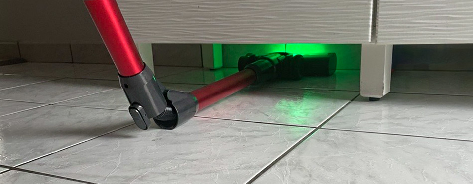 On retrouve sur la brosse principale pour sols durs un faisceau lumineux vert qui s’active à l’allumage ; celui-ci permet de mettre en lumière les poussières et autres saletés qui traînent par terre, mais qui sont invisibles à l’œil nu. Le nettoyage s’en trouve sensiblement amélioré. J’ai pu constater en effet que les poils de mon chien ressortaient beaucoup mieux et qu'une vérification avant/après ne laissait aucun doute quant à l’efficacité de cette option. De plus, il est très appréciable de retrouver cette fonctionnalité haut de gamme sur un modèle plus abordable. Je valide !