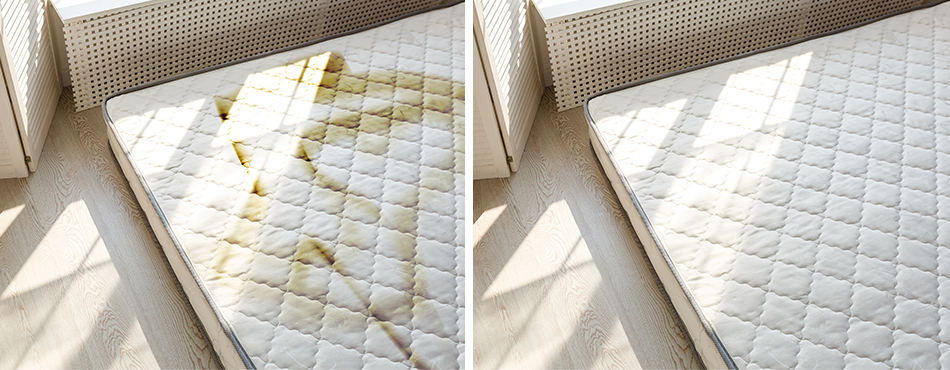 Premier réflexe, allez chercher un rouleau de papier absorbant pour retirer l'humidité. Saupoudrez ensuite le matelas de bicarbonate de soude, laissez agir quelques minutes et passez l'aspirateur. Renouvelez cette opération deux ou trois fois. Pour nettoyer la tache, vous pouvez utiliser du vinaigre blanc ou de l'ammoniaque si elle est très incrustée. Ensuite, il est important de laisser sécher dans une pièce bien ventilée.