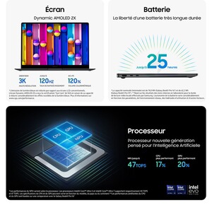 7922604Ecran 16" Dyn. AMOLED 2X WQXGA+ 2880x1800 (16:10) tactile 120Hz, Anti-Reflet ; Processeur Intel Core Ultra 7 256V ; Puce Graphique Intel ARC ; 512 Go SSD - RAM 16 Go LPDDR5X ;Windows 11 - Wi-Fi - Bluetooth 5.4