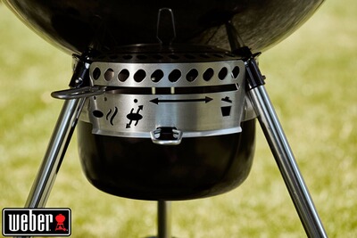 La cuisson est parfaitement contrôlée grâce au thermomètre analogique intégré au couvercle, qui permet de surveiller la température sans avoir à ouvrir le barbecue et perdre de la chaleur. Les clapets de ventilation réglables, situés sur la cuve et sur le couvercle, jouent un rôle essentiel dans la gestion du flux d’air. Ils permettent d’ajuster précisément l’intensité du feu, offrant ainsi une grande polyvalence, que ce soit pour une cuisson vive ou plus douce et maîtrisée.